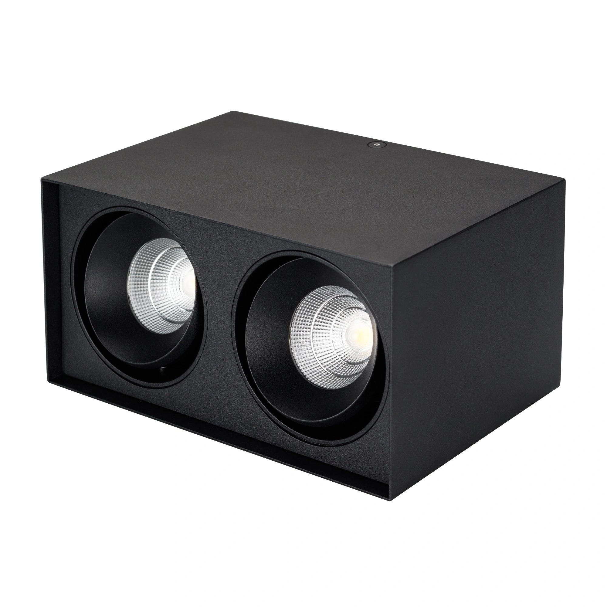 Накладной интерьерный светильник. Мощность 2x11 Вт, св. поток 1660 лм, 75 лм/Вт, теплый 3000 K, CRI>90, угол 40°, регулируемое направление луча 30°, напряжение питания 230 В. Черный квадратный корпус из алюминия, степень защиты IP20. Размер: длина 100 мм, ширина 200 мм, высота 135 мм. Монтаж накладной. Драйвер 18-24 В, 500 мА (2 штуки), пульсация <5%.