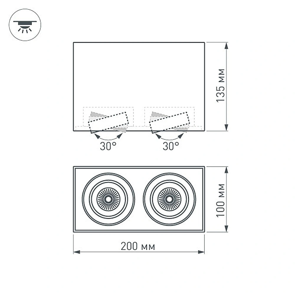 Накладной светодиодный светильник SP-CUBUS-S100x200WH-2x11W Warm White 40deg мощностью 22 Вт с теплым белым цветом свечения (3000 K) и световым потоком 1660 лм для создания основного и декоративного освещения в жилых, офисных и торговых помещениях. Регулируемый световой модуль с углом наклона 30° позволяет легко менять световые акценты в помещении. Индекс цветопередачи CRI>80 и узкий угол излучения 40° обеспечивают качественный свет, не вызывающий переутомления глаз. Корпус изготовлен из высококачественных материалов, которые позволяют сохранить эстетичный внешний вид светильника на протяжении всего срока эксплуатации. Светильник устанавливается накладным методом на потолок и подключается с помощью встроенного драйвера напрямую к сети 230 В.