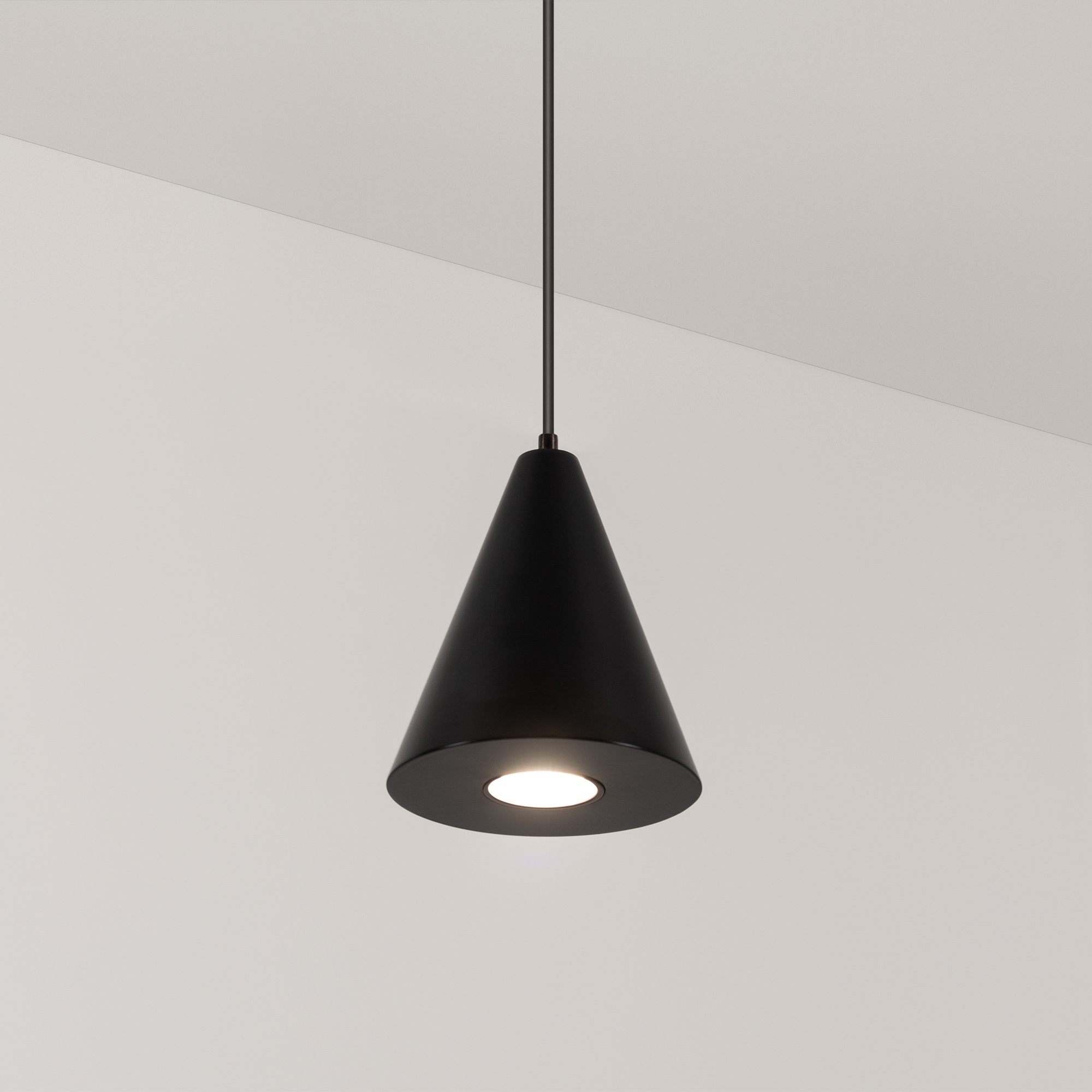Подвесной светильник SP-ELEMENTA-CONE-R83-9W Day4000 (BK, 39 deg, 230V) мощностью 9 Вт с дневным белым цветом свечения (4000 К) и индексом цветопередачи CRI>80 предназначен для освещения торговых, офисных, жилых и других помещений. У светильника стильный дизайн и качественное исполнение, поэтому он станет не только источником света, но и стильным декоративным элементом любого интерьера. Световой поток 650 лм и узкий угол излучения 39° помогут при создании световых акцентов. Коэффициент пульсации менее 5% гарантирует комфортное и приятное для глаз освещение без мерцания. Подвесной монтаж и удобная регулировка длины подвеса без специального инструмента. Встроенный драйвер обеспечивает быстрое подключение к сети переменного тока 230 В.