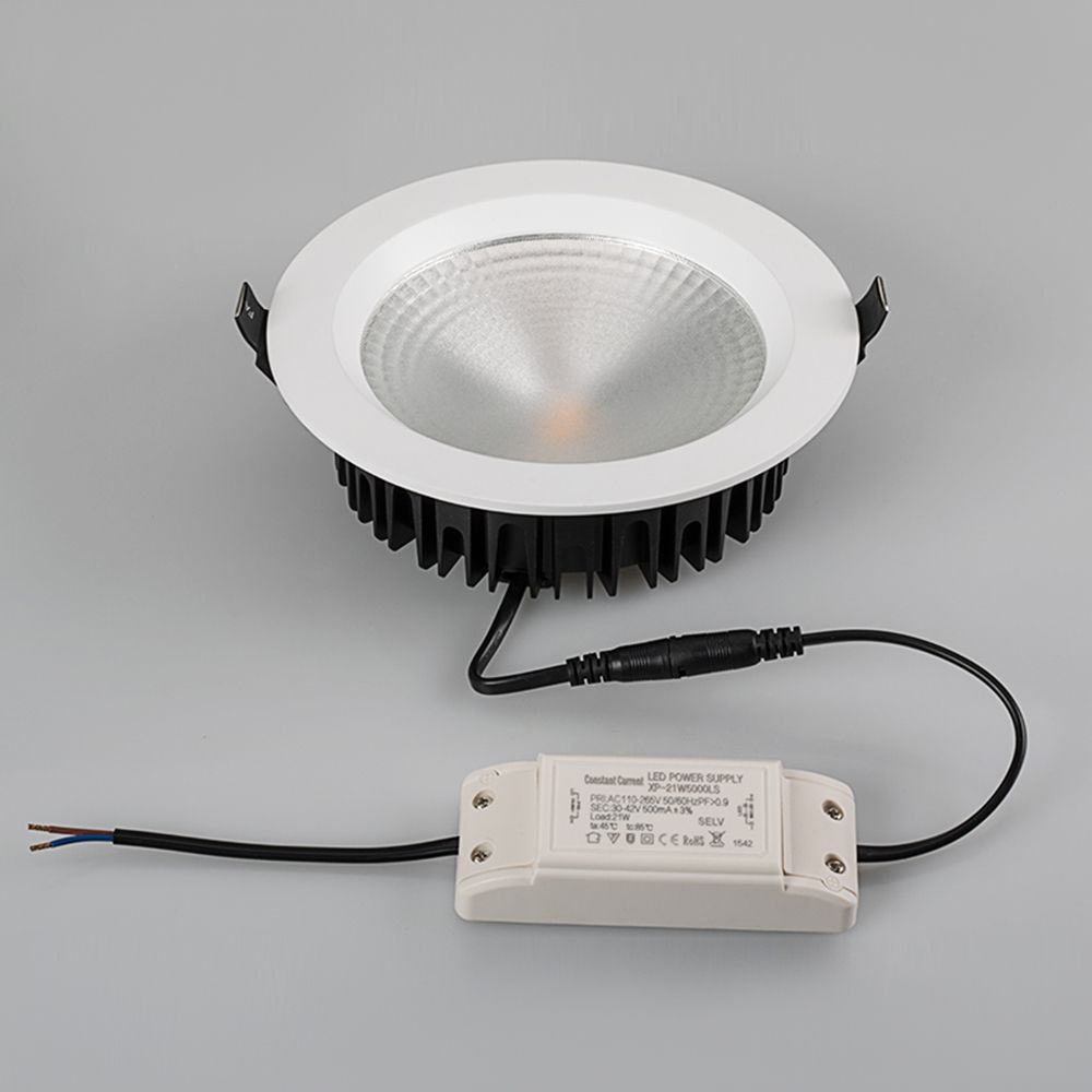 Встраиваемый круглый светильник c индексом CRI>80 обеспечивает отличную цветопередачу и равномерное освещение без мерцания. Особая конфигурация алюминиевого корпуса позволяет эффективно отводить тепло и продлевает срок службы светодиодов. Белый цвет корпуса будет гармонично смотреться в любом интерьере. Уникальный рассеиватель придает модели оригинальный внешний вид. Светильник с широким углом рассеивания 110 градусов и эффективностью 90 лм/Вт обеспечивает качественный свет. Светильник легко устанавливается с помощью пружин в монтажное отверстие. В комплекте поставляется драйвер, что позволяет безопасно и быстро подключать светильник напрямую к сети переменного тока 230 В. Корпус с защитой на уровне IP44 предотвращает попадание пыли, влаги, а также брызг воды. Имеется возможность диммирования при замене драйвера. Предназначен для основного и локального освещения в жилых, коммерческих и общественных помещениях.