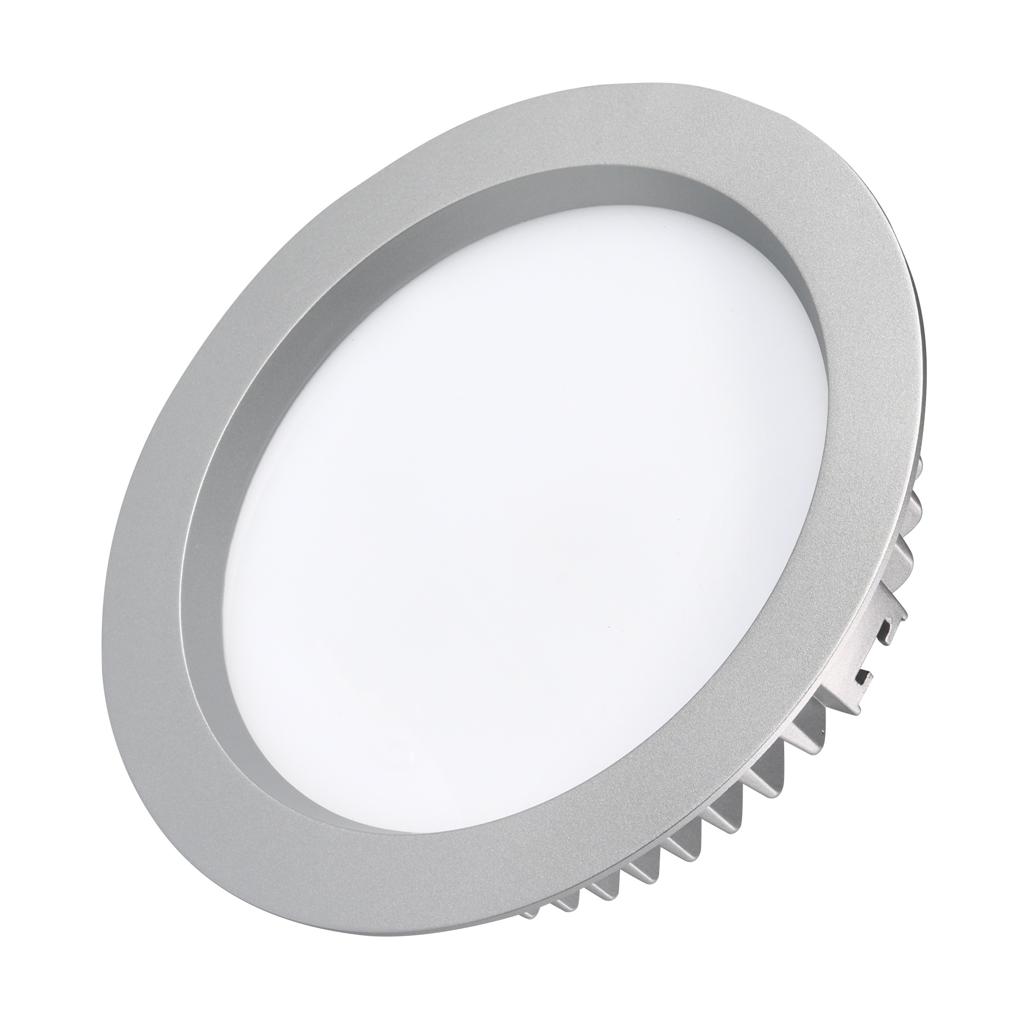 Встраиваемый светильник "Даунлайт" 35Вт. Цвет свечения БЕЛЫЙ 5700К, или ДНЕВНОЙ 4000К, или ТЕПЛЫЙ 3000К, выбор цвета свечения при установке, фиксированный. Световой поток 2700 лм, угол 90°, CRI>80. Серебристый корпус. Питание AC 100-240V. Габариты: Ф230х45мм, врезное отверстие 200 мм. Драйвер в комплекте (30-40V, 800mA).