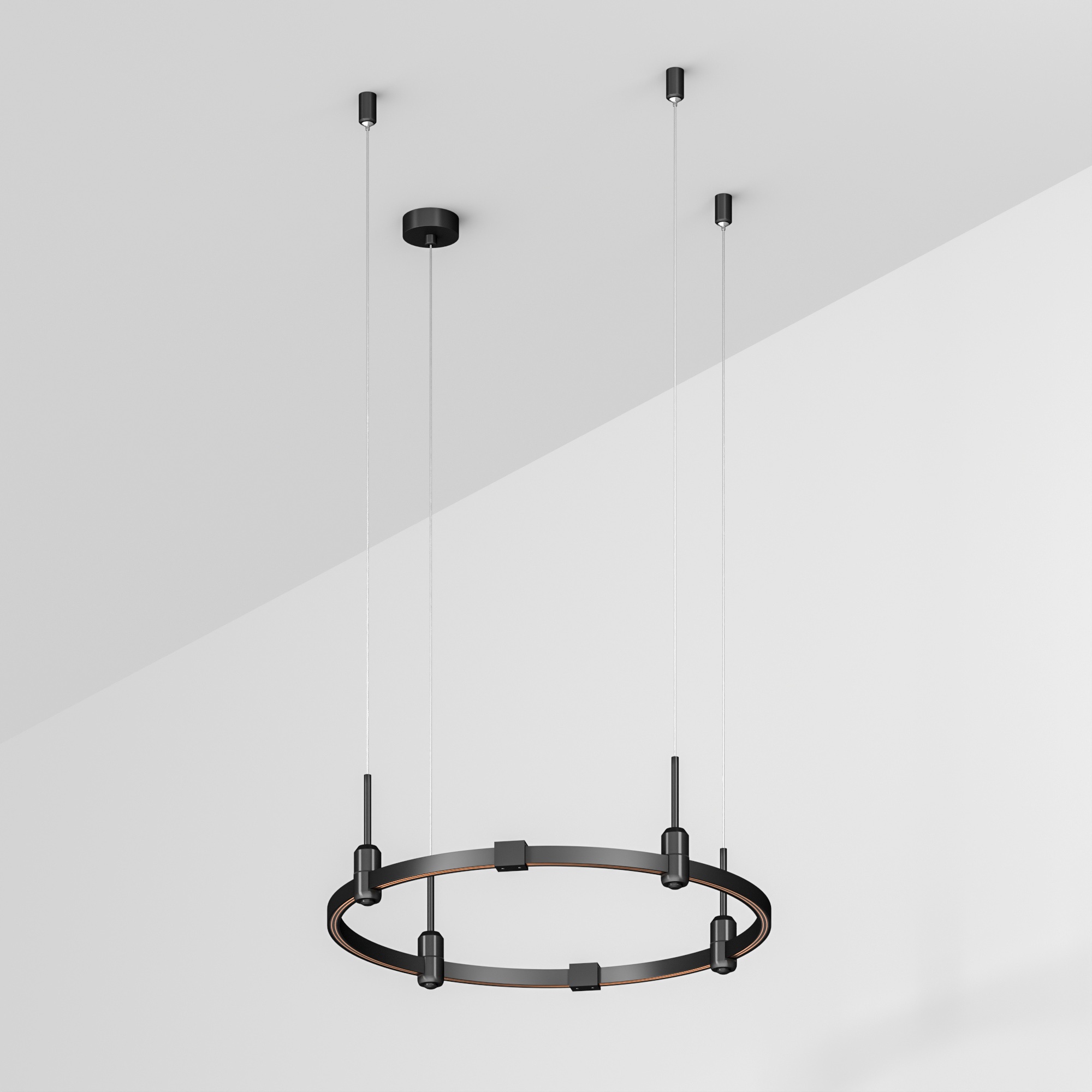 Подвесная конструкция APRIORI, форма круг. В комплекте треки с аксессуарами и гибкими подвесами длиной 1500мм Размер: диаметр 600мм, высота 22мм. Монтируется подвесным способом. Шинопровод рассчитан на работу с безопасным напряжением DC48В. Изготавливается из алюминия, цвет черный. Светильники и источники питания приобретаются отдельно.