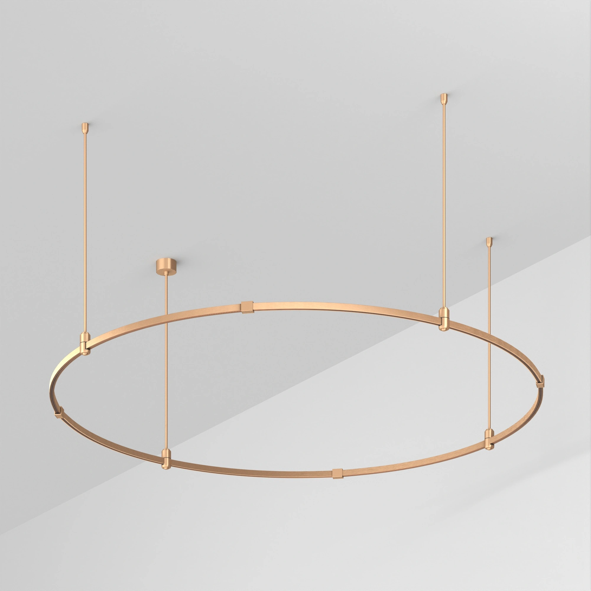 Подвесная конструкция APRIORI, форма круг. В комплекте треки с аксессуарами и жесткими подвесами длиной 800мм Размер: диаметр 1800мм, высота 22мм. Монтируется подвесным способом. Шинопровод рассчитан на работу с безопасным напряжением DC48В. Изготавливается из алюминия, анодированного в цвет светлое золото. Светильники и источники питания приобретаются отдельно.