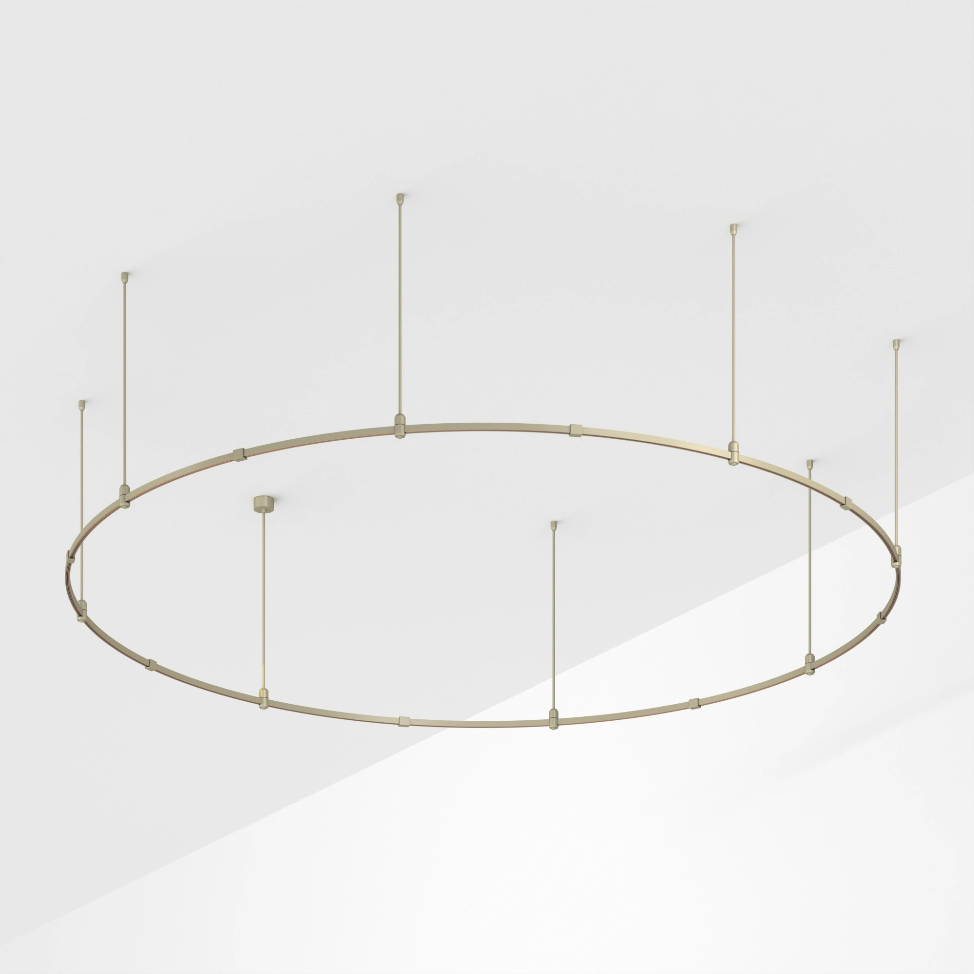 Подвесная конструкция APRIORI, форма круг. В комплекте треки с аксессуарами и жесткими подвесами длиной 800мм Размер: диаметр 3000мм, высота 22мм. Монтируется подвесным способом. Шинопровод рассчитан на работу с безопасным напряжением DC48В. Изготавливается из алюминия, анодированного в цвет серо-оливковый. Светильники и источники питания приобретаются отдельно.