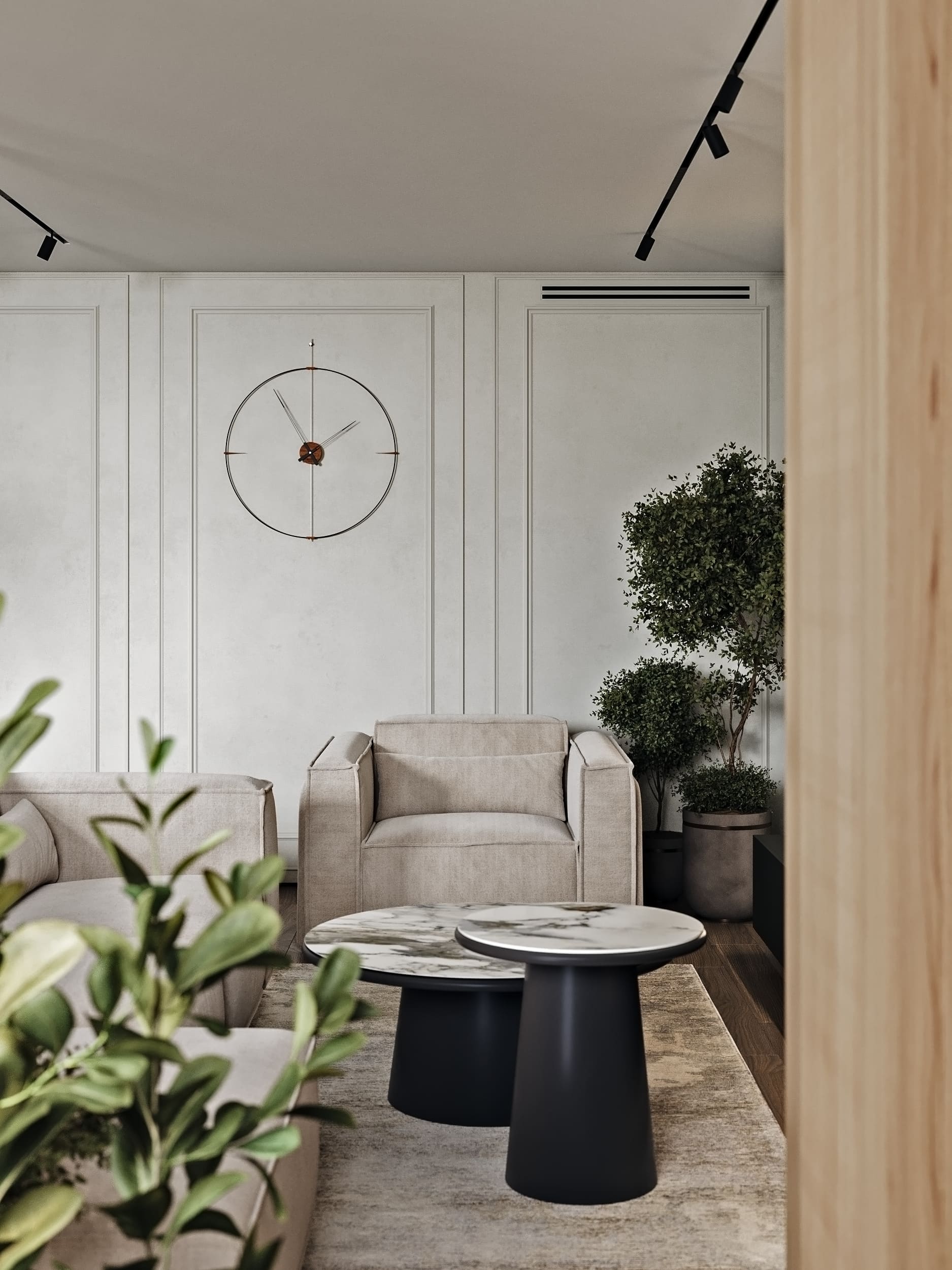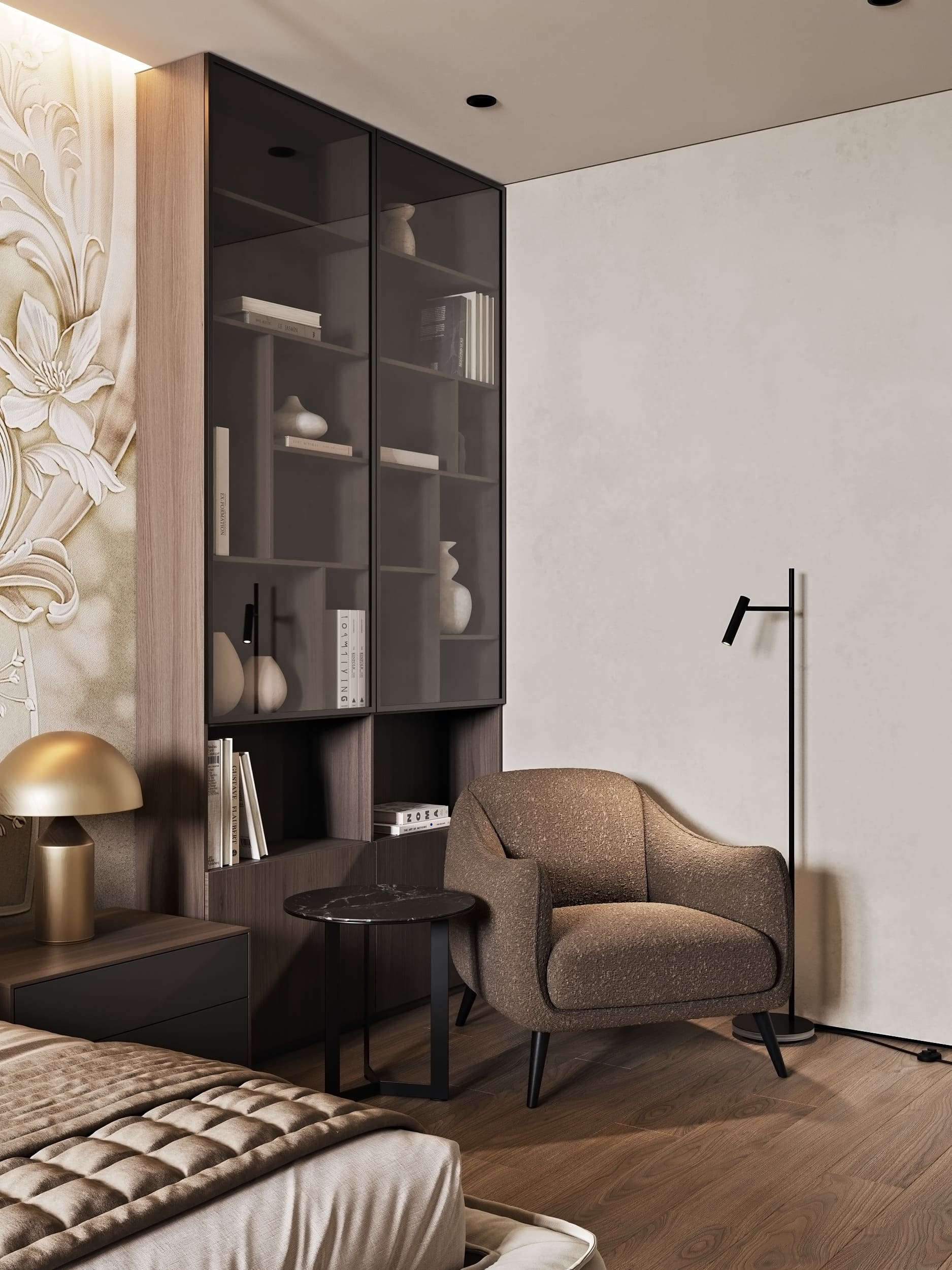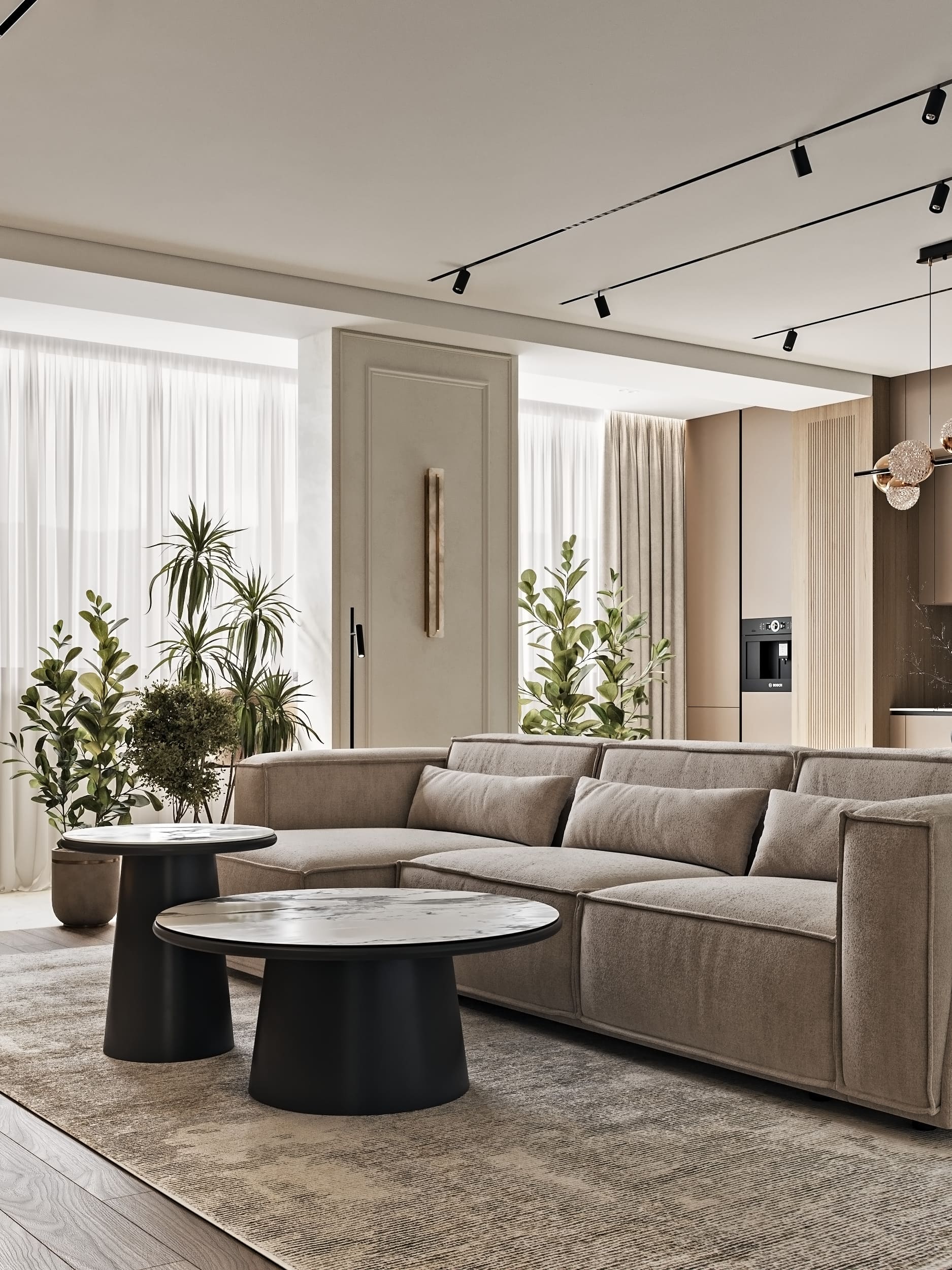 Цветовая палитра построена на светлых природных оттенках с чёрными графичными элементами и латунными акцентами.