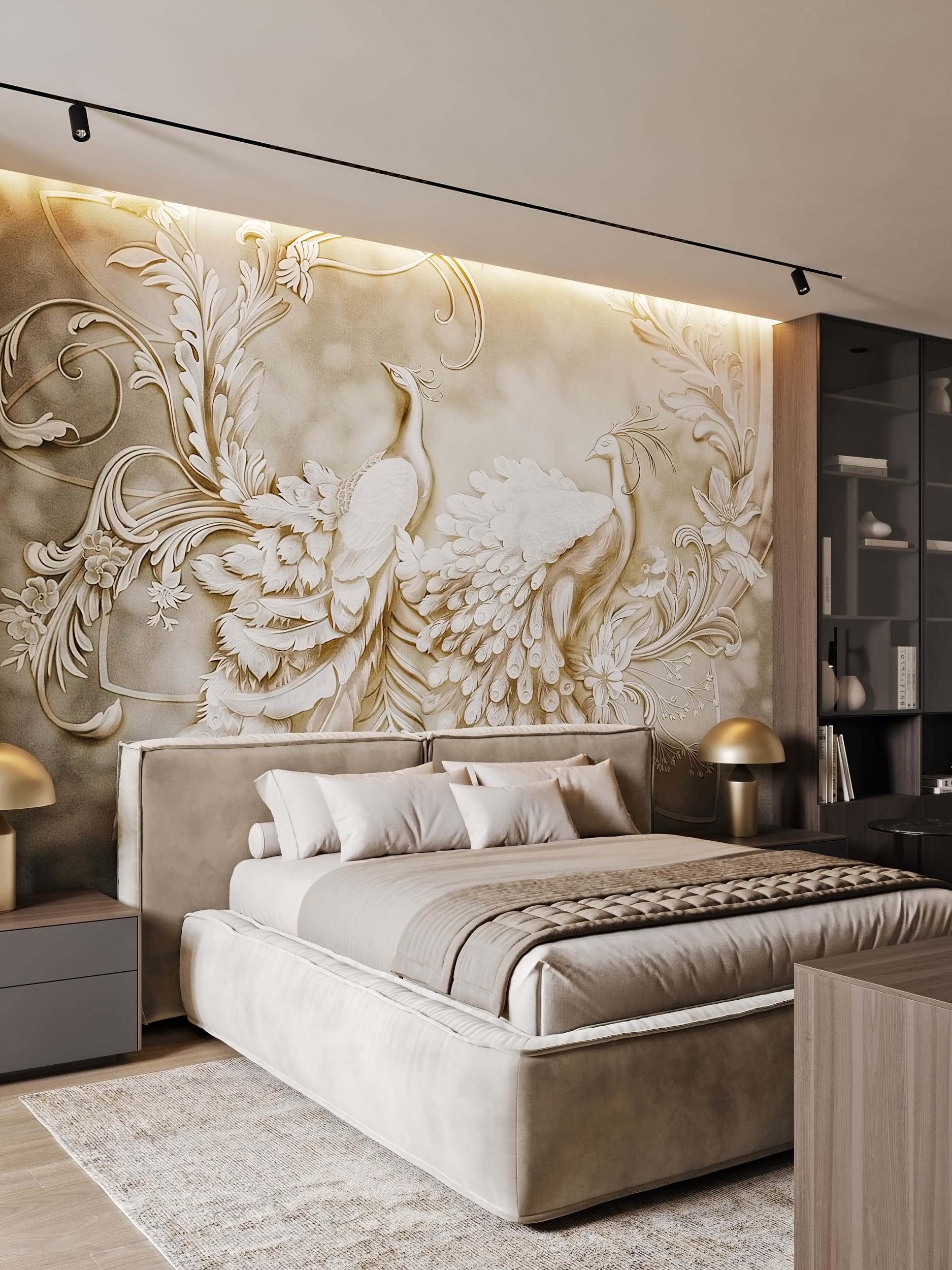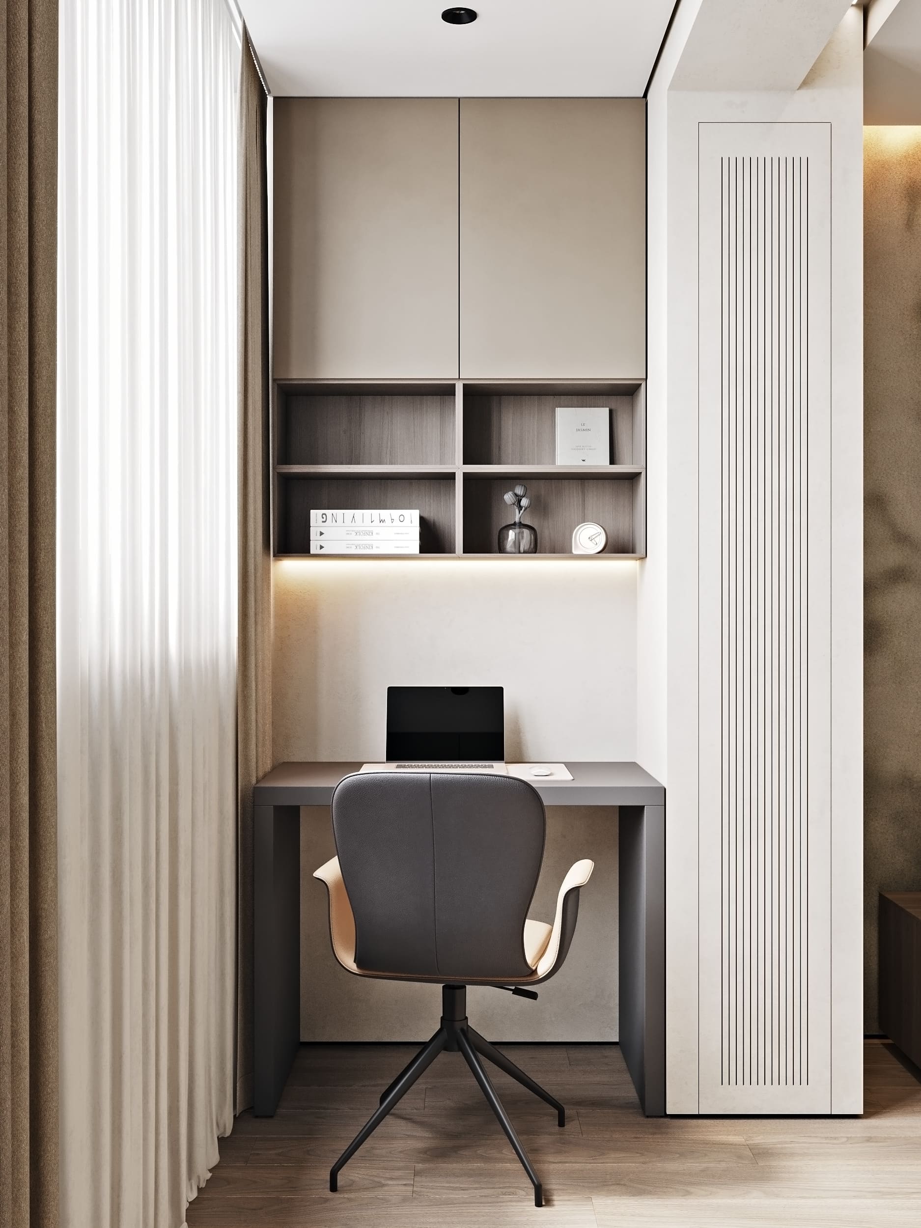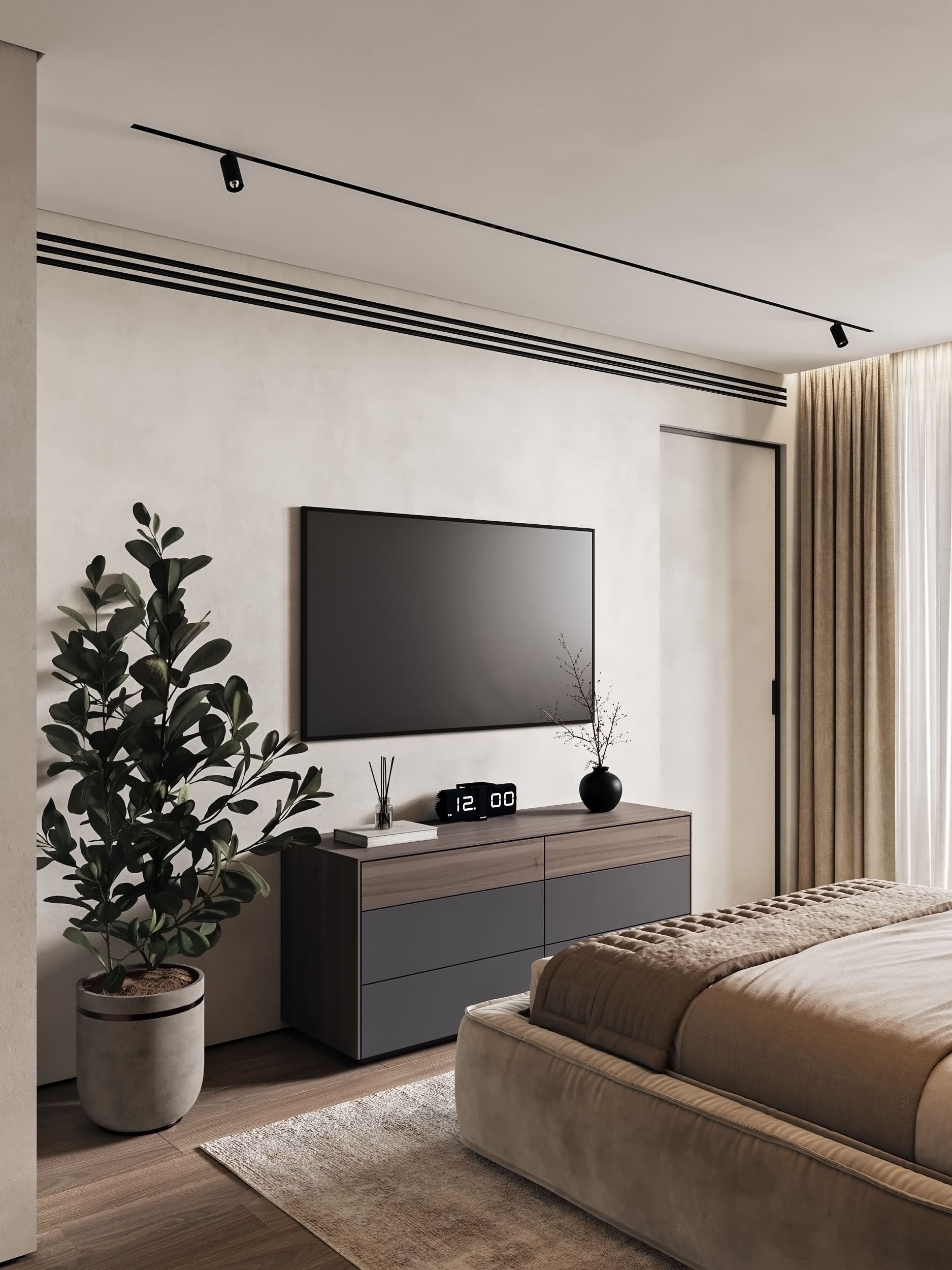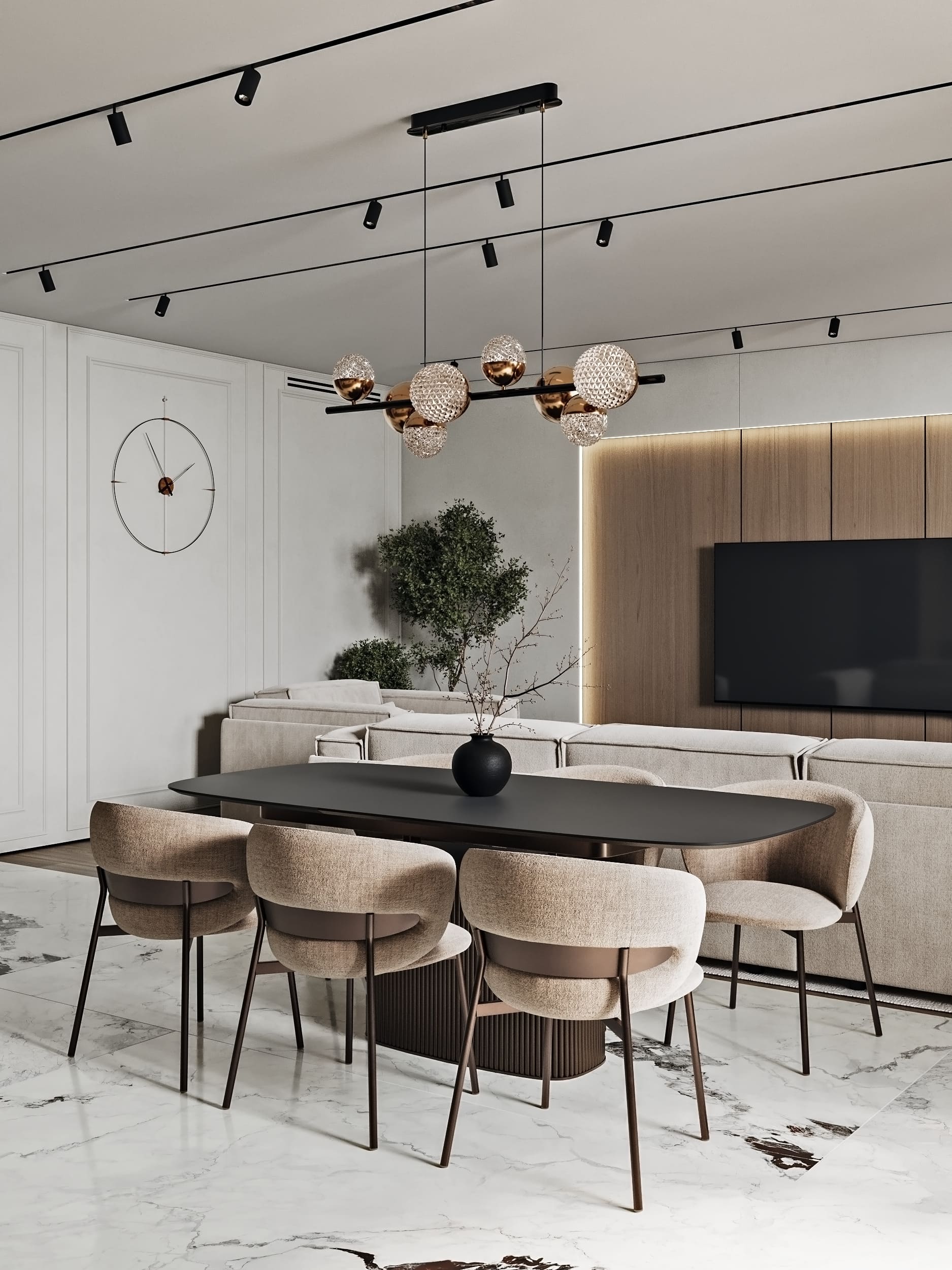 Цветовая палитра построена на светлых природных оттенках с чёрными графичными элементами и латунными акцентами.
