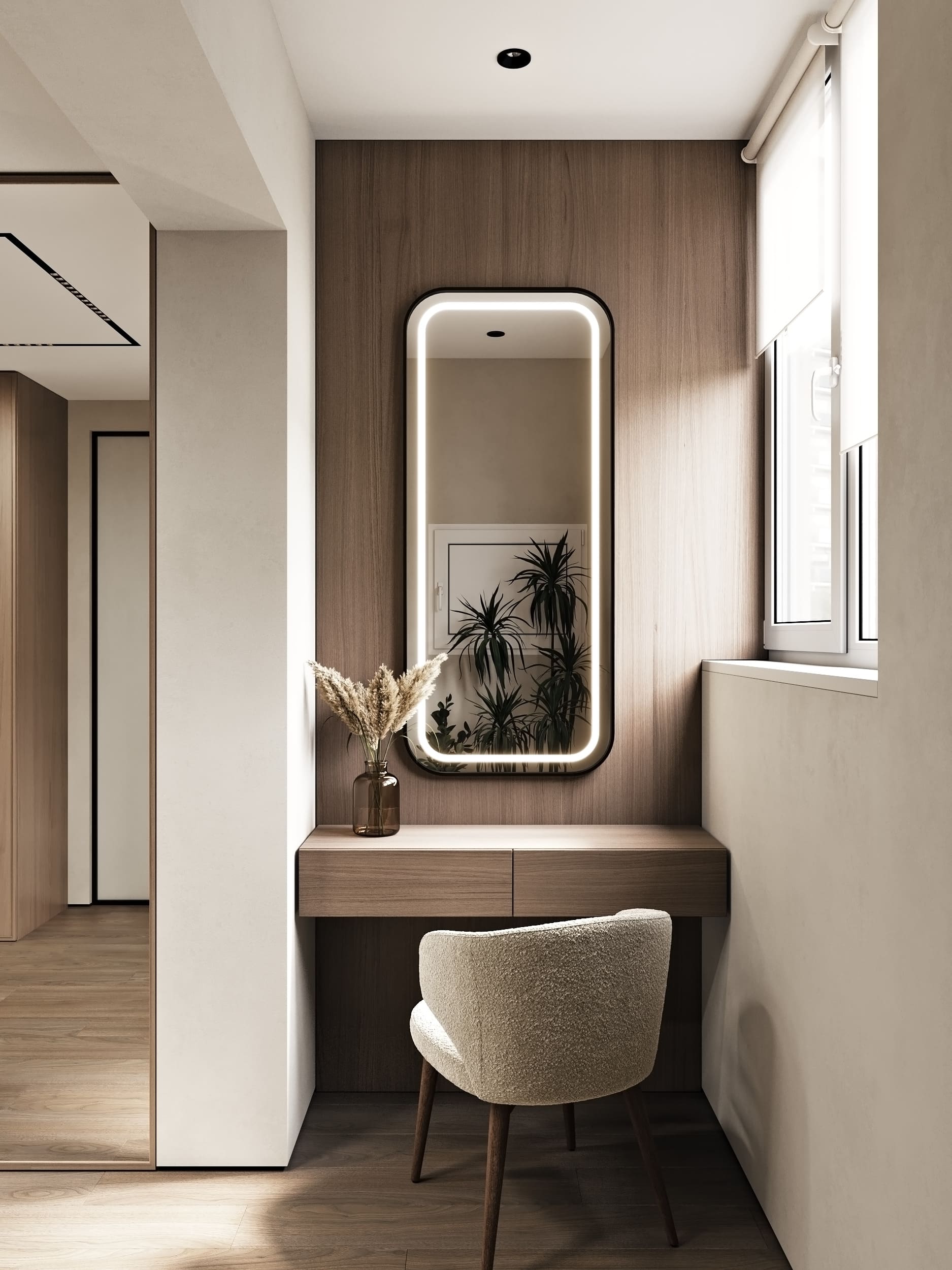 в гостиной реализован встроенный камин с эффектом пламени и функцией увлажнения воздуха.