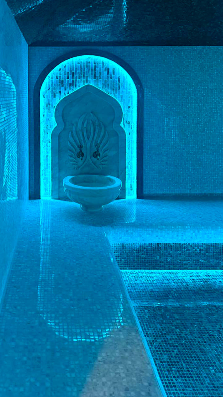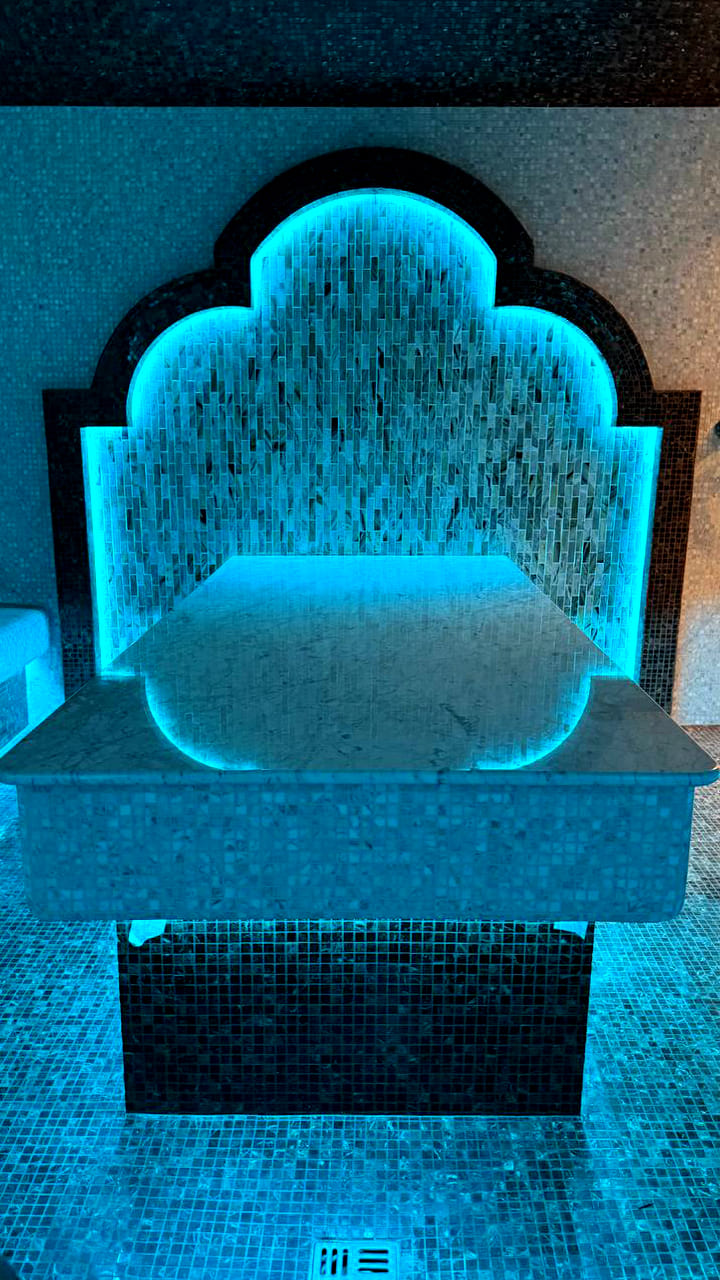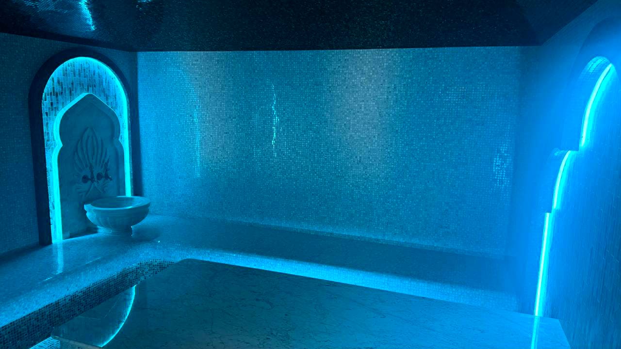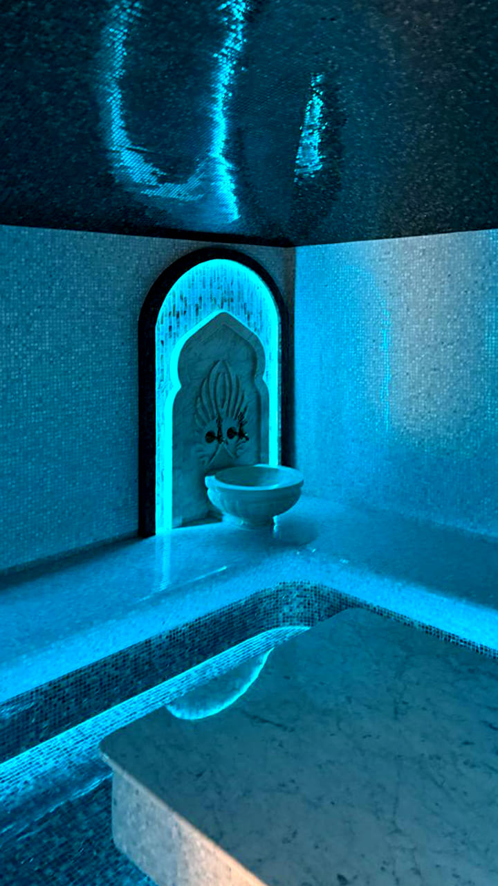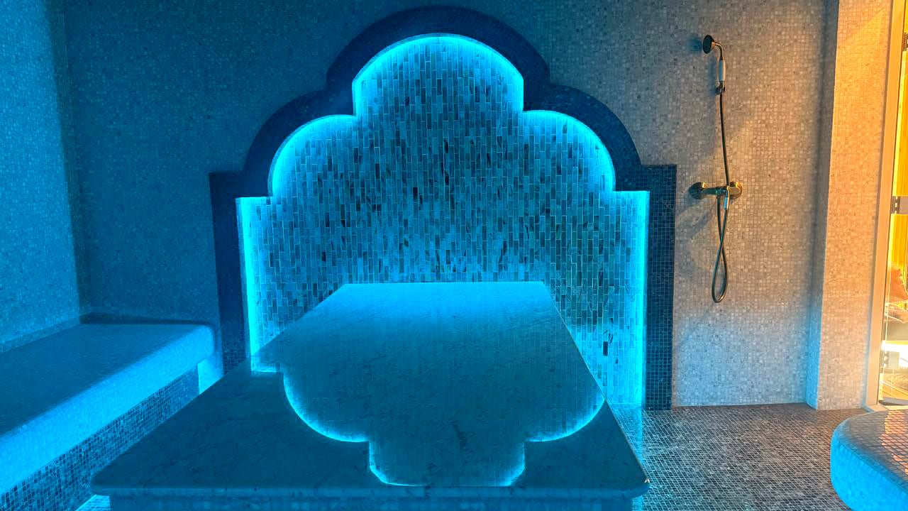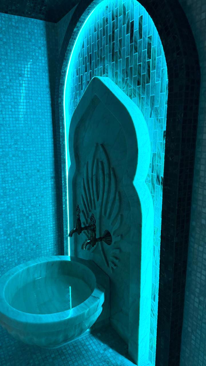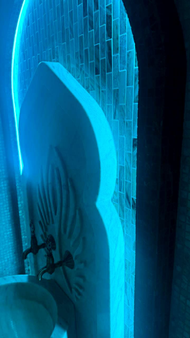 Такой свет подчеркивает архитектуру хаммама и делает ее живой. Отражения на мозаике, мерцание на куполе, игра света в паре — всё это создаёт ощущение восточного уюта и роскоши.