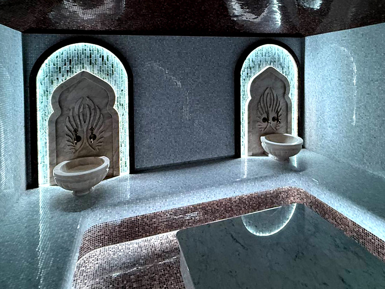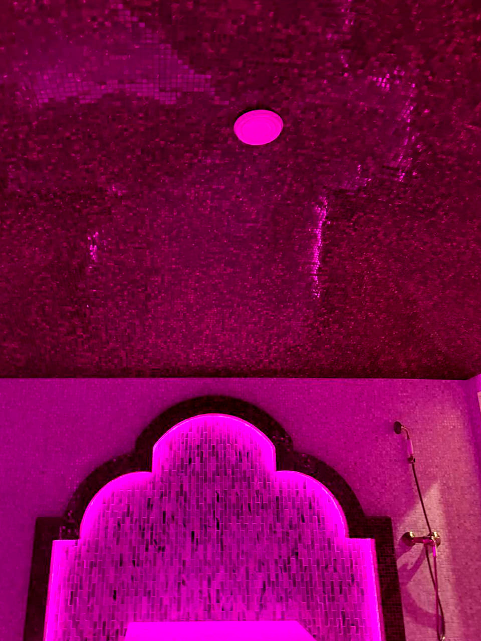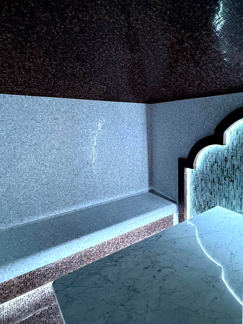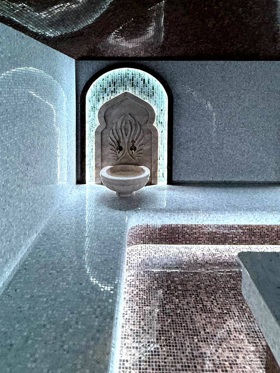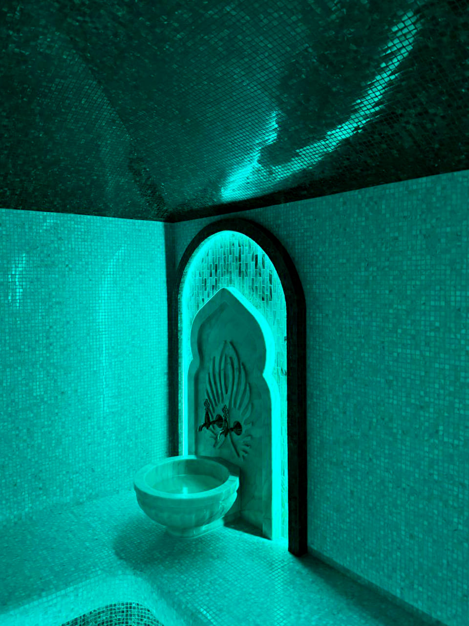 Такой свет подчеркивает архитектуру хаммама и делает ее живой. Отражения на мозаике, мерцание на куполе, игра света в паре — всё это создаёт ощущение восточного уюта и роскоши.