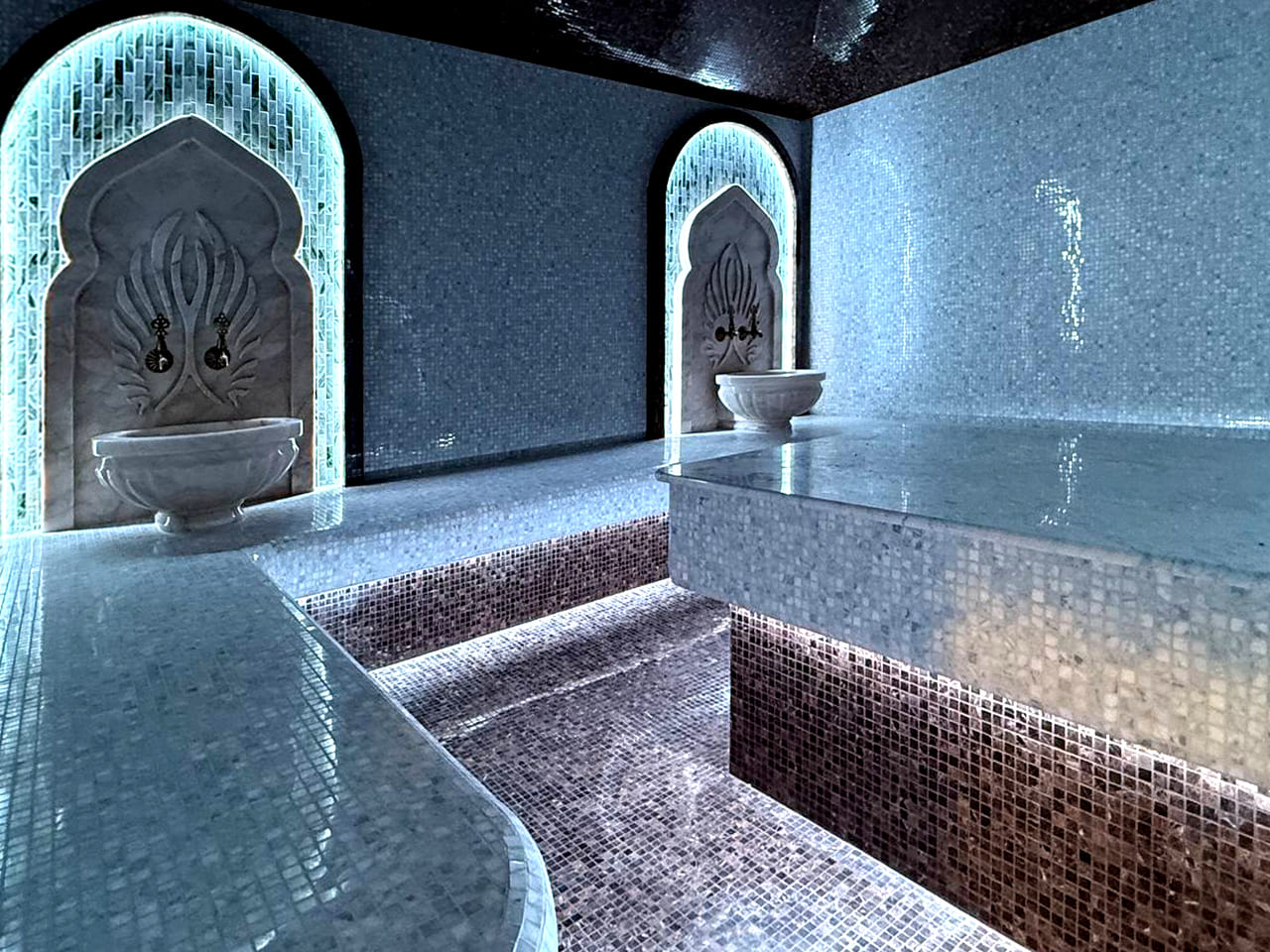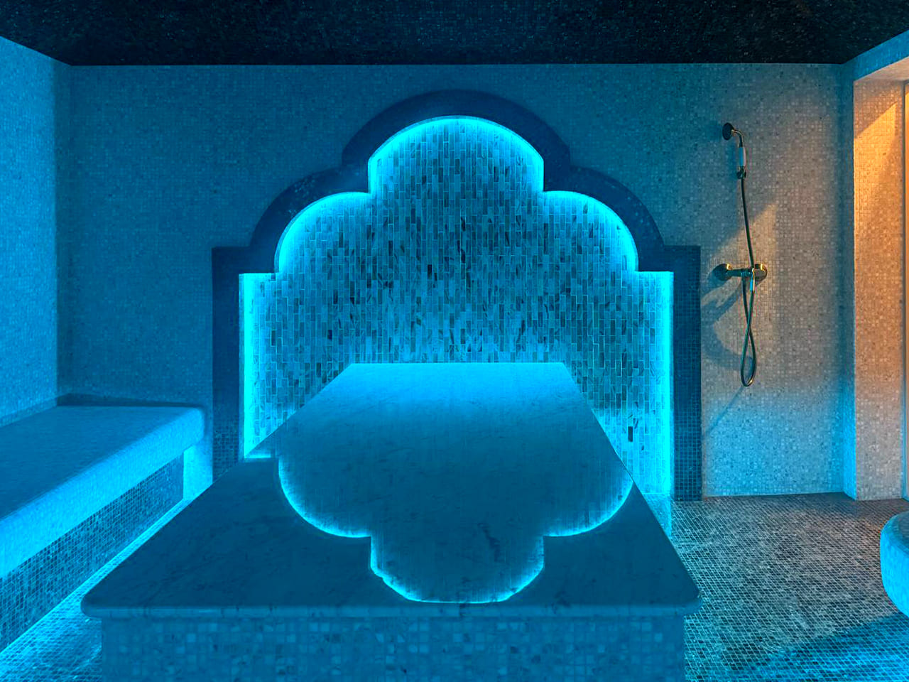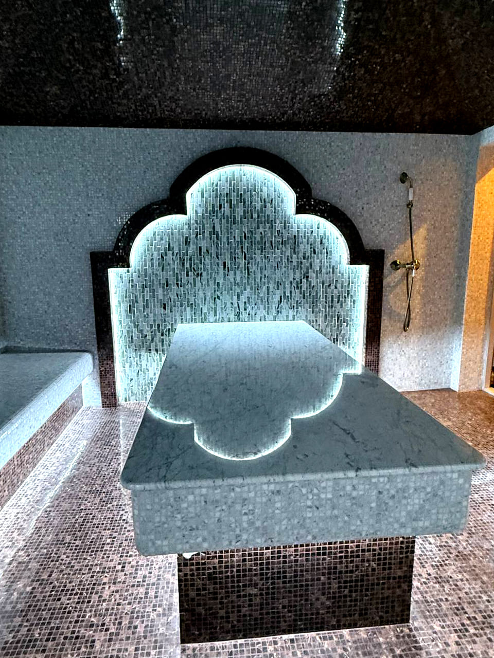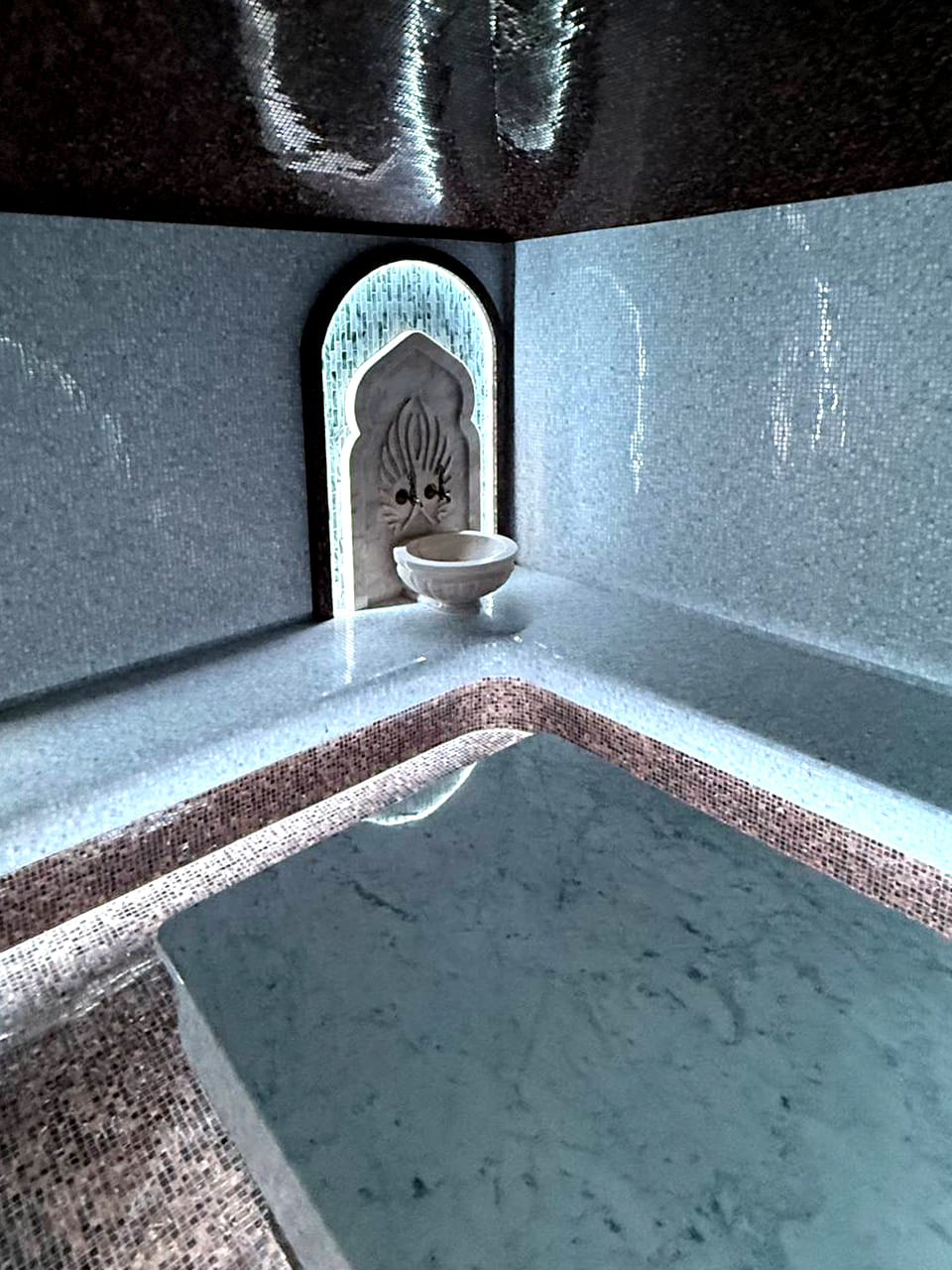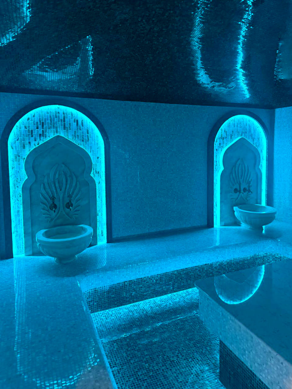 Такой свет подчеркивает архитектуру хаммама и делает ее живой. Отражения на мозаике, мерцание на куполе, игра света в паре — всё это создаёт ощущение восточного уюта и роскоши.