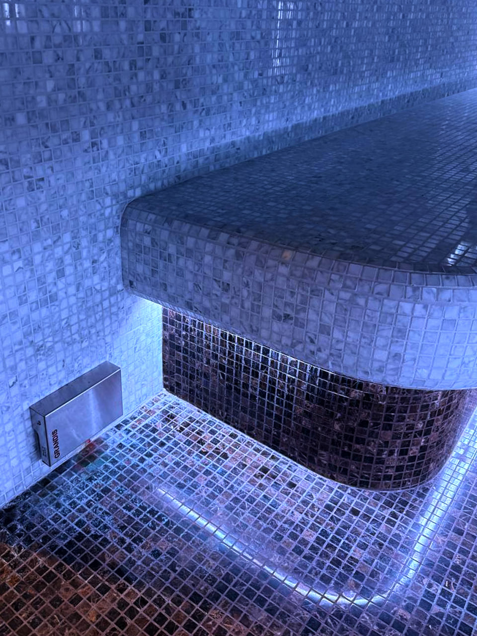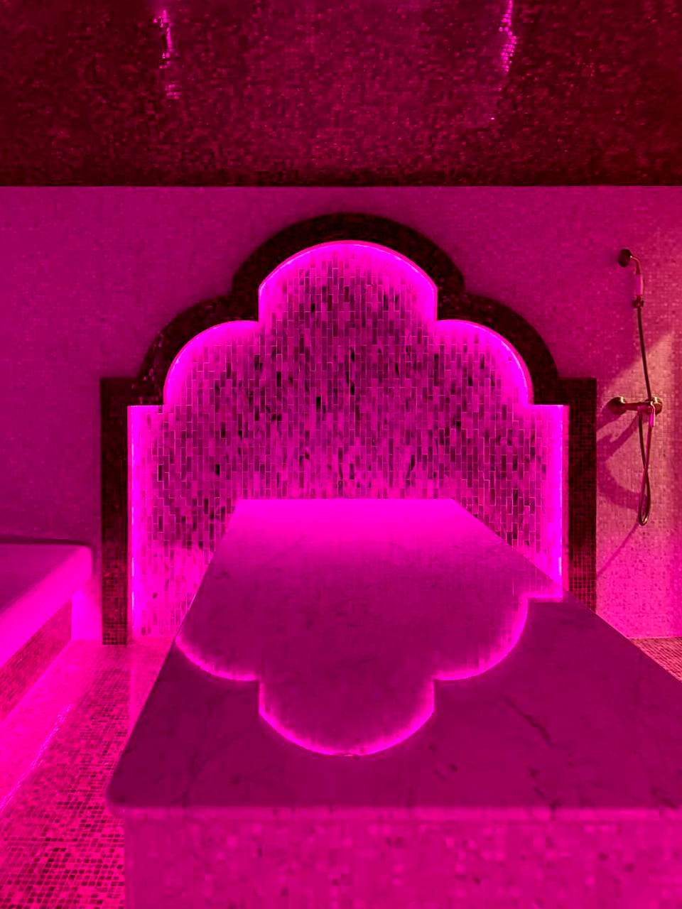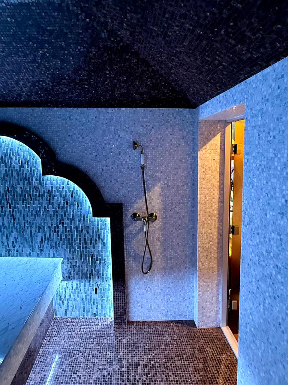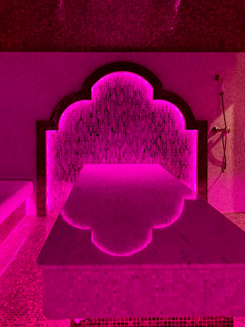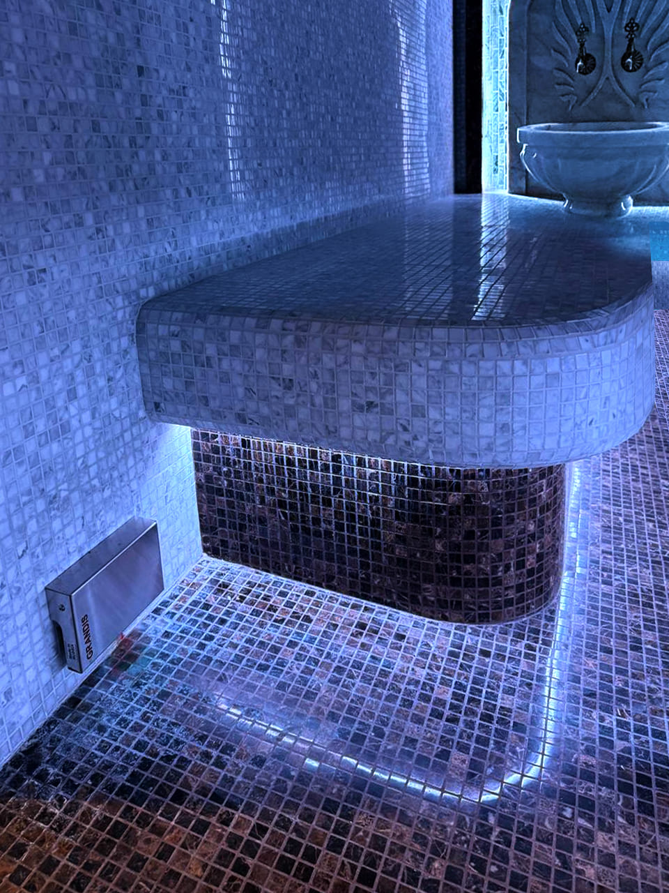 Такой свет подчеркивает архитектуру хаммама и делает ее живой. Отражения на мозаике, мерцание на куполе, игра света в паре — всё это создаёт ощущение восточного уюта и роскоши.