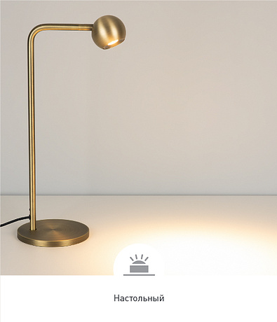 Декоративный настольный светильник. Мощность 6 Вт, св. поток 540 лм, 90 лм/Вт, теплый 3000К, CRI>90, угол 30°, напряжение питания 230 В.Бронзовый корпус из алюминия (основание, ножка, светоизлучаль в форме шара), степень защиты IP20. Размер основания Ø140×11 мм, размер ножки Ø12,5×430х120 мм, размер светоизлучателя Ø65×55,5 мм. Длина провода 1580 мм, питание от сети 220-240V., пульсация <1%