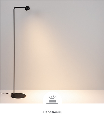 Декоративный напольный светильник. Мощность 6 Вт, св. поток 540 лм, 90 лм/Вт, теплый 3000К, CRI>90, угол 30°, напряжение питания 230 В. Черный корпус из алюминия (основание, ножка, светоизлучаль в форме шара), степень защиты IP20. Размер основания Ø210×11 мм, размер ножки Ø12,5×1220х160 мм, размер светоизлучателя Ø65×55,5 мм. Длина провода 1930 мм, питание от сети 220-240V. Пульсация < 1%
