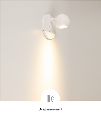 Встраиваемый настенный светильник. Мощность 6 Вт, св. поток 580 лм, 100 лм/Вт, теплый 3000 K, CRI>90, угол 30°, напряжение питания 230 В. Белый круглый корпус из алюминия, степень защиты IP20. Габариты: Ø110х103 мм, размер основания Ø110х8 мм, размер светового модуля Ø65×55,5 мм. IP20. Встроенный USB порт для зарядки (TYPE-C). Выключатель на корпусе.