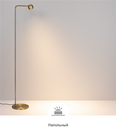 Декоративный напольный светильник. Мощность 6 Вт, св. поток 540 лм, 90 лм/Вт, теплый 3000К, CRI>90, угол 30°, напряжение питания 230 В. Бронзовый корпус из алюминия (основание, ножка, светоизлучаль в форме шара), степень защиты IP20. Размер основания Ø210×11 мм, размер ножки Ø12,5×1220х160 мм, размер светоизлучателя Ø65×55,5 мм. Длина провода 1930 мм, питание от сети 220-240V. Пульсация < 1%