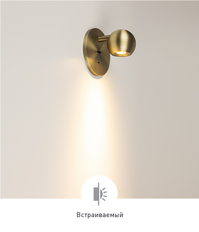 Встраиваемый настенный светильник. Мощность 6 Вт, св. поток 580 лм, 100 лм/Вт, теплый 3000 K, CRI>90, угол 30°, напряжение питания 230 В. Бронзовый круглый корпус из алюминия, степень защиты IP20. Габариты: Ø110х103 мм, размер основания Ø110х8 мм, размер светового модуля Ø65×55,5 мм. IP20. Встроенный USB порт для зарядки (TYPE-C). Выключатель на корпусе.