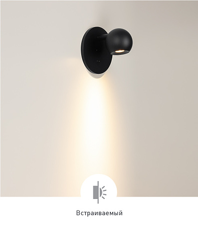 Встраиваемый настенный светильник. Мощность 6 Вт, св. поток 580 лм, 100 лм/Вт, теплый 3000 K, CRI>90, угол 30°, напряжение питания 230 В. Чёрный круглый корпус из алюминия, степень защиты IP20. Габариты: Ø110х103 мм, размер основания Ø110х8 мм, размер светового модуля Ø65×55,5 мм. IP20. Встроенный USB порт для зарядки (TYPE-C). Выключатель на корпусе.
