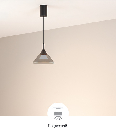 Подвесной светильник. Мощность 7 Вт, св. поток 355 лм, 50 лм/Вт, теплый 3000К, CRI>94, угол 30°, напряжение питания 230 В. Черный корпус из алюминия с конусообразным стеклянным плафоном дымчатого цвета, степень защиты IP20. Размер: диаметр плафона 200 мм, высота плафона 180 мм. Монтаж подвесной, длина подвеса 1500 мм, регулируемая. Габариты чаши (накладная) Ø75 x 120 мм. Драйвер 25-40 В, 150 мА, пульсация <1%.