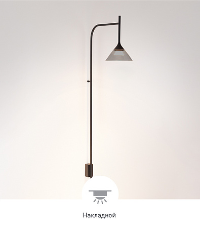 Настенный светильник. Мощность 7 Вт, св. поток 355 лм, 50 лм/Вт, теплый 3000К, CRI>94, угол 30°, напряжение питания 230 В. Черный корпус из алюминия с конусообразным стеклянным плафоном дымчатого цвета, степень защиты IP20. Размеры: диаметр плафона 200 мм, высота плафона 180 мм, высота светильника 1010 мм. Монтаж настенный. Драйвер 12В, 750 мА, пульсация <1%.