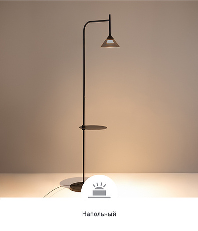Напольный светильник. Мощность 7 Вт, св. поток 355 лм, 50 лм/Вт, теплый 3000К, CRI>94, угол 30°, напряжение питания 230 В. Черный корпус из алюминия с конусообразным стеклянным плафоном дымчатого цвета, степень защиты IP20. Размеры: диаметр плафона 200 мм, высота плафона 180 мм, диаметр напольной базы 300 мм, общая высота светильника 1590 мм. Сенсорная кнопка на ножке: короткое нажатие - on/off, длинное нажатие - регулировка яркости. Монтаж напольный, также возможна регулировка столика. Драйвер 24 В, 750 мА, пульсация <1%.