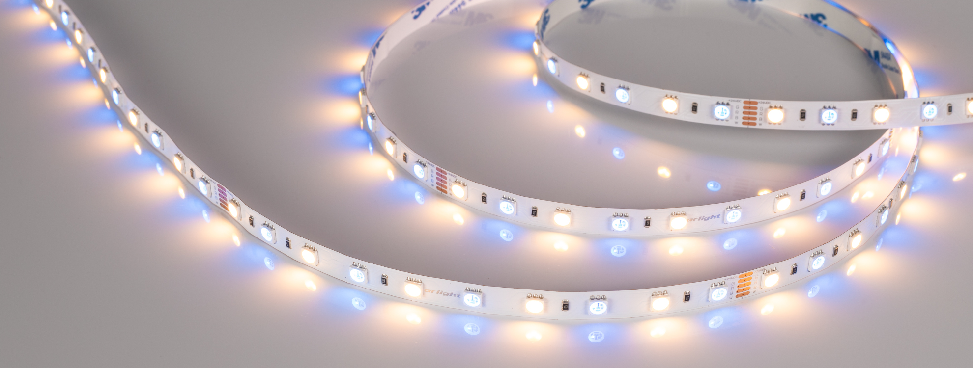 Ленты с управлением цветом и тоном, серия B60. Тип светодиодов 5060 (B), 60 светодиодов на 1 метр. Герметизация IP65, тип покрытия SE - герметик закрывает верхний слой платы. Лента 4-в-1 со смешением цветов и белого тона. Декоративная мультицветная подсветка ниш, элементов интерьера.