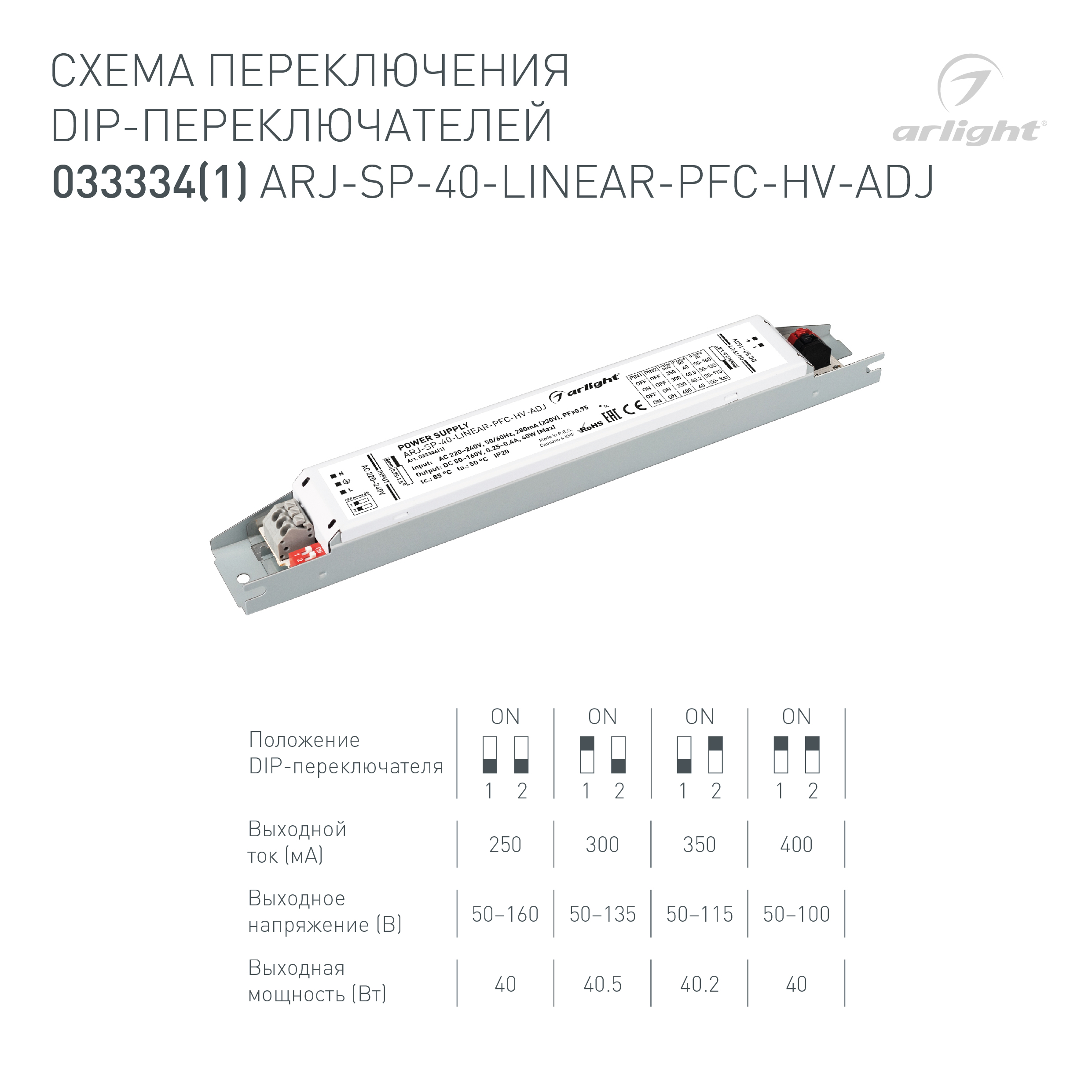 Блок питания ARJ-SP-40-LINEAR-PFC-HV-ADJ (40W, 250-400mA) (Arlight, IP20 Металл, 5 лет)