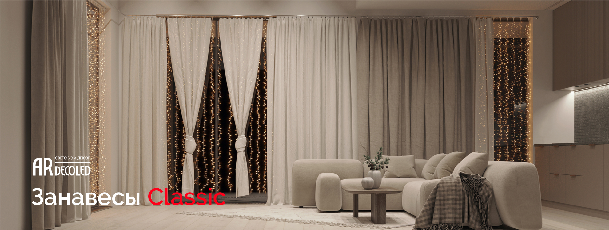 Светодиодный Занавес Classic. Размер 2000x6000 мм (длина 2000 мм, высота 6000 мм). 20 ниспадающих нитей длиной 6000 мм. 1500 светодиодов размером 7 мм. Цвет свечения ТЕПЛЫЙ БЕЛЫЙ (3000 К), постоянное свечение и 8 динамических эффектов с резким световым рисунком (прозрачная вогнутая линза). Провод прозрачный, ПВХ. Питание 230 В, Мощность 60 Вт, защита IP65, применение в помещении и на улице под навесом. Аксессуар для подключения и выбора режима свечения в комплекте.